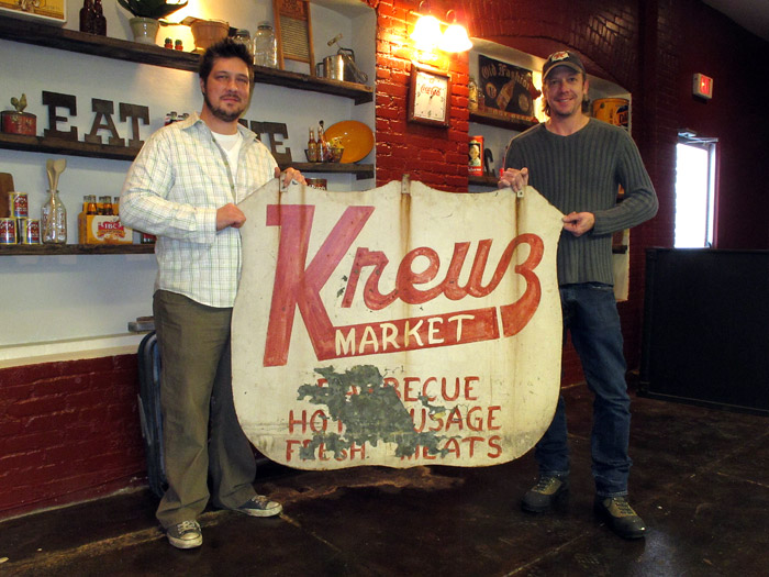 In the photo above, Tim, left, and Jeff pose with an original Kreuz Market sign that once hung at the legendary Lockhart BBQ joint. They will sell Kreuz Market sausage, some of the best in the world, and Tim trained with equally legendary Kreuz Market pitmaster Roy Perez.