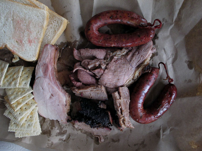 Posse pitmaster Marshall Cooper, his son Mark & I sampled the meat spread shown above. We ordered brisket, shoulder clod, a pork chop and Kreuz jalapeno sausage. Jim Rossman and Gary Barber joined in on the meatfest as well. There was nothing left but grease-soaked butcher paper when we were done.
