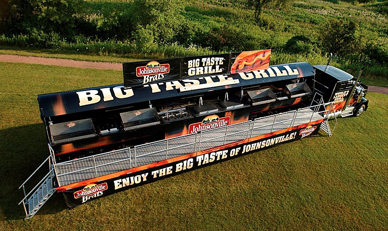 The semi-tractor-hauled cooker weighs 53,000 pounds, is 65 feet long, 20 feet high and 6 feet in diameter, according to materials sent to us by Johnsonville, the sausage company. A dozen cooks can grill 750 brats at a time.